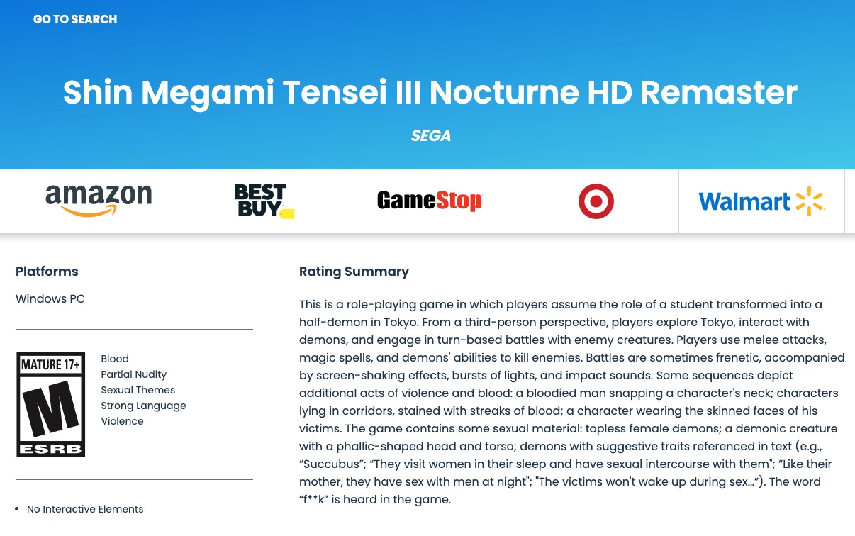 【《真女神转生3 HD》或将登陆Steam,PC版分级信息曝光】ESRB和PEGI两家分级机构先后发布了《真女神转生3 HD版》PC版的分级信息,这意味着游戏或在不久的将来登陆Steam平台。《真女神转生3 HD版》是ATLUS经典作品的高清复刻版,在保留经典剧情的同时,追加了角色语音,新增“仁慈”难度。本作在20年10月就登陆了亚洲区的PS4和Switch平台,并计划在今年春季登陆欧美地区。目前官方尚未公布PC版消息,此次评分信息出现或许意味着PC版已经不远了。
