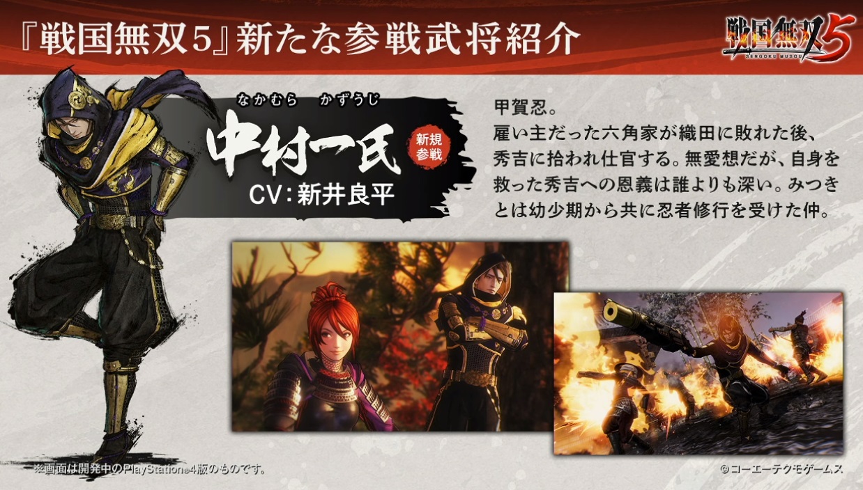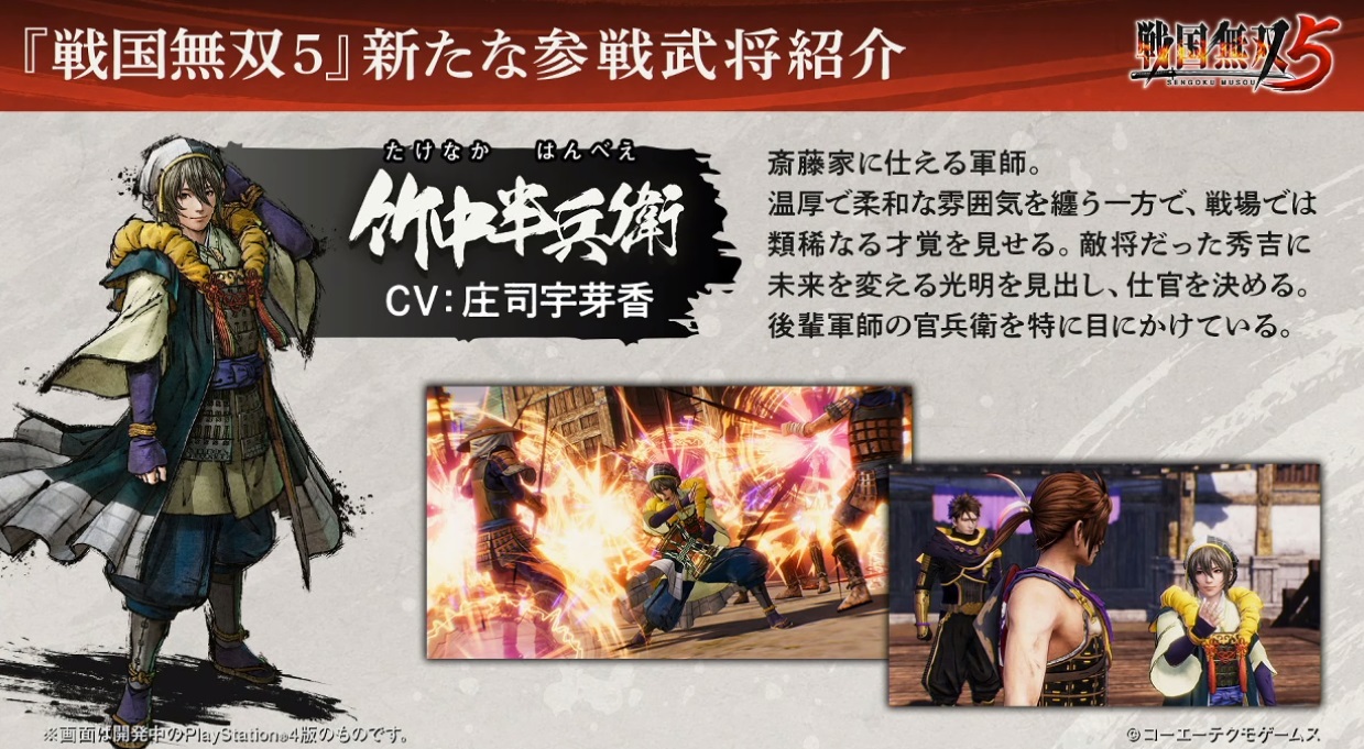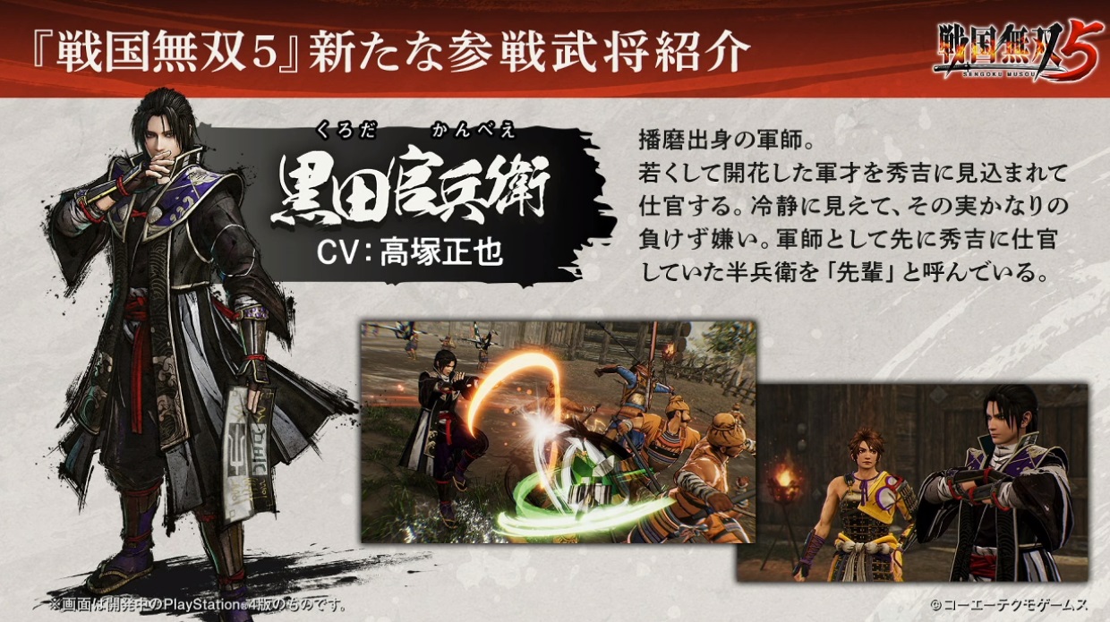 【《战国无双5》直播速报: 新武将5名、新动作系统“神速”“闪技”公开】今晚光荣特库摩在刚刚举办的《战国无双5》直播活动中公布了有关本作的最新情报,首先介绍了新登场角色分别为2军事1忍者1武将1人妻(家康正室),竹中半兵卫(CV:庄司宇芽香)、黑田官兵卫(CV:高塚正也)、系列首次参战的中村一式(DV:新井良平)、濑名(CV:照井春佳)、山中鹿介(CV:阿座上洋平);然后展示了本作的初实机演示(长良川之战),及新动作系统“神速”“闪技”;最后是本作豪华版“treasure box”和“一骑当千box”实物介绍。