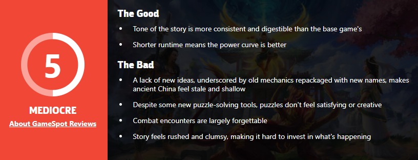 GameSpot认为本次DLC的整体叙事氛围相较于本体比较连贯并易于理解,游戏整体节奏较快不用重复去锻炼角色能力。但是整个内容缺乏新意,换皮的东西太多让中国元素看起来并不是很好。尽管加入了一些新的解谜道具但谜题本身质量不高且缺少创造性。而整款DLC中战斗部分的占比也有些少,整个故事显得粗糙仓促,无法使人投入。