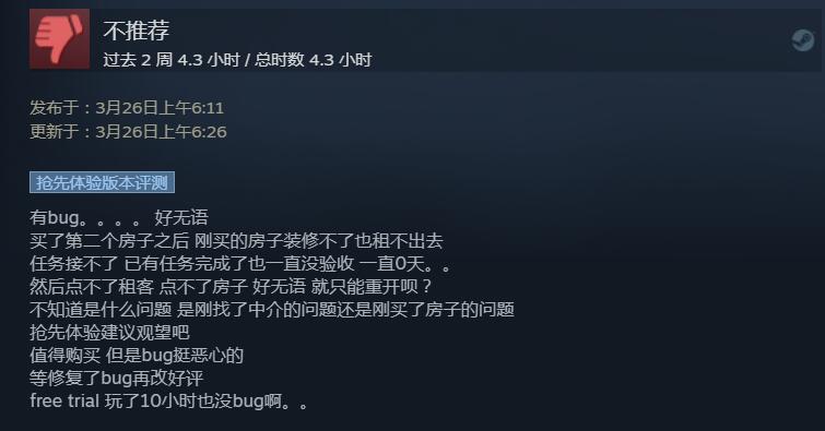 【“房东模拟器”《租房达人》上线Steam,目前总评为“特别好评”】“房东模拟器”《租房达人》已在昨天于Steam平台开启抢先体验,目前游戏总评为“特别好评”(203篇玩家评价),好评率为89%。从玩家评价来看,在《租房达人》中你除了需要应对各种不同个性的租客之外,还可以通过悉心设计公寓,来提升你租房金额。不过目前来说,过多的BUG问题成为了差评的主要原因,不少玩家甚至吐槽BUG数量比之前的测试版本还要多,很影响游玩体验。