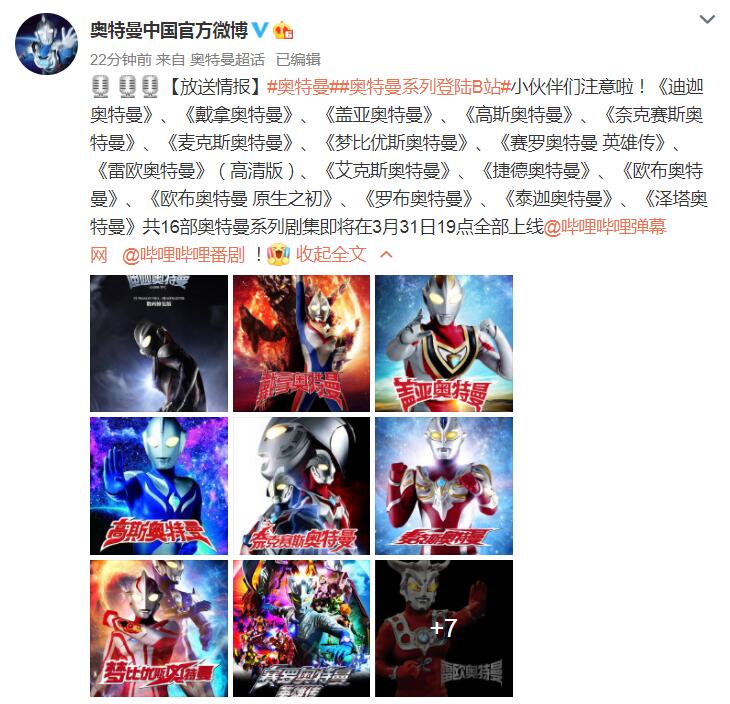 【16部《奥特曼》系列剧集将于3月31日上线bilibili平台】奥特曼中国官方微博确认,16部奥特曼系列剧集即将在3月31日19点全部上线bilibili平台,分别为:《迪迦奥特曼》、《戴拿奥特曼》、《盖亚奥特曼》、《高斯奥特曼》、《奈克赛斯奥特曼》、《麦克斯奥特曼》、《梦比优斯奥特曼》、《赛罗奥特曼 英雄传》、《雷欧奥特曼》(高清版)、《艾克斯奥特曼》、《捷德奥特曼》、《欧布奥特曼》、《欧布奥特曼 原生之初》、《罗布奥特曼》、《泰迦奥特曼》、《泽塔奥特曼》。