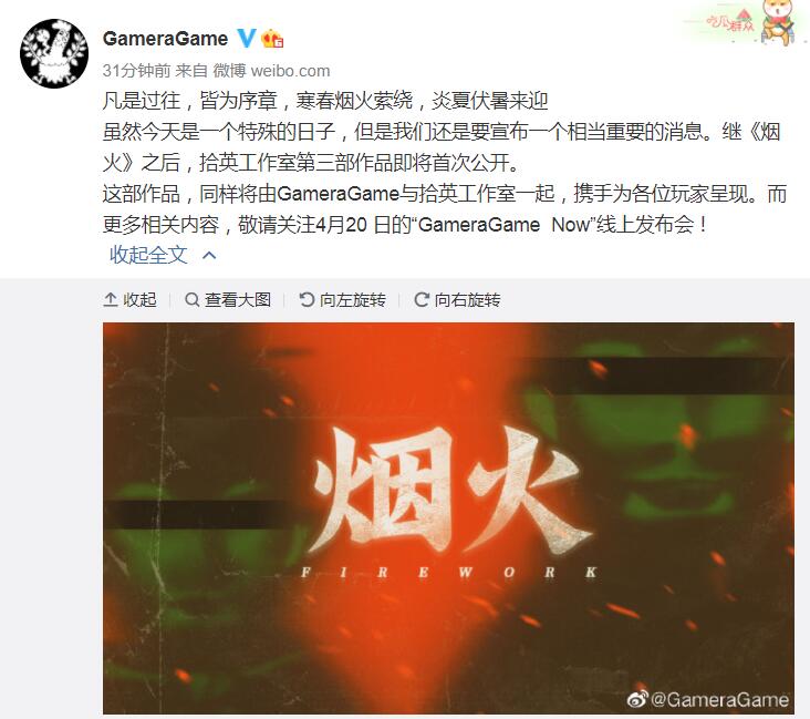 【《烟火》开发商新作仍采用本土题材,时代背景或与《烟火》有所关联】发行商GameraGame今天确认,《烟火》开发团队拾英工作室的第三部作品即将正式公开,这款新作仍然会扎根于开发团队所擅长的本土题材,甚至在时代背景上可能和《烟火》有所关联,更多相关内容届时将在4月20日的“GameraGame Now”线上发布会揭晓。