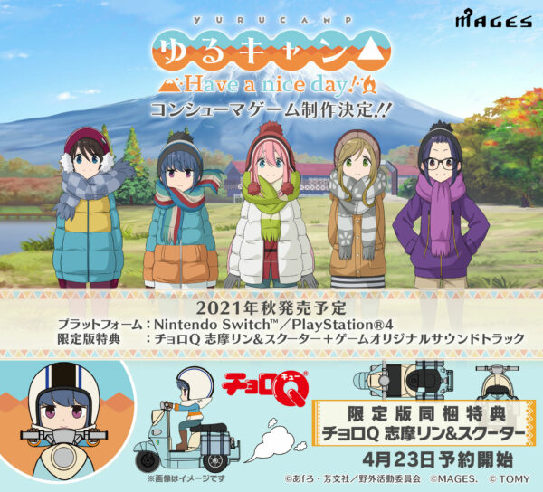 【MAGE.S《摇曳露营△美好的一天》今秋登陆PS4及Switch】MAGES.开发的《摇曳露营》主机版游戏定名为《摇曳露营△美好的一天》(Laid-Back Camp: Have a nice day!)。官方宣布游戏将于今年秋季登陆PS4和Switch平台,限定版游戏将同捆原声音乐集和志摩凛骑行小绵羊摩托手办,预购将于4月23日开启。除此之外,官方暂未透露游戏的更多细节。