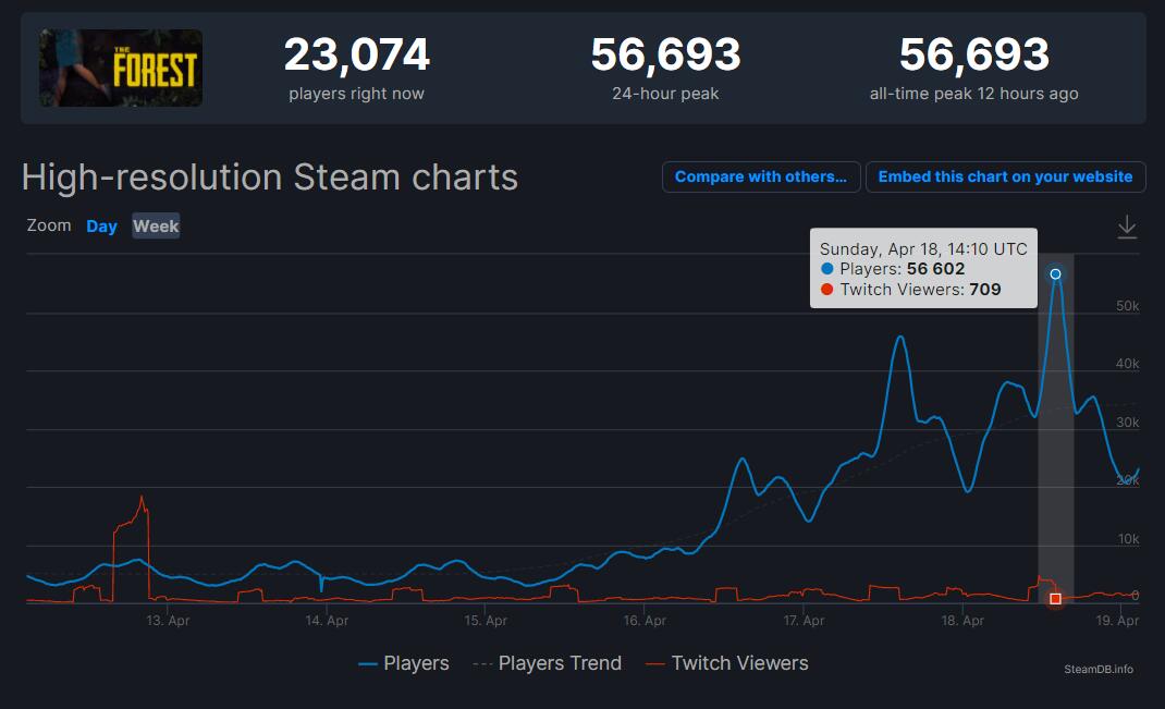 【《森林》Steam在线人数破5万,达游戏发售6年来最高纪录】开放世界恐怖生存游戏《森林》最近在Steam上开启了折扣特惠。而游戏的在线人数也历史性地突破新高,达到了发售以来前所未有的高度。从SteamDB的图表中可以看到,从大约4月16日起游戏的在线人数开始飞速上涨,直到昨天一度达到了5万人,而这也是游戏自2015年上线以来,最高的在线人数纪录,此前最高的数据也就三万出头。《森林》是一款可以多人合作的恐怖生存冒险游戏,玩家可以与好友一起对抗神秘森林中的恐怖野人,同时游戏也包含多种生存要素,玩家可以收集木材建造营地,收集食物制作武器等等目前本作在Steam上打4折,史低价28元,支持中文,好评率94%特别好评。