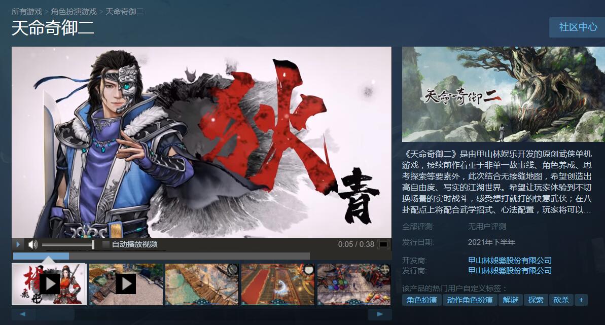 【《天命奇御二》Steam页面上线,多张全新实机画面公布】甲山林娱乐新作《天命奇御二》Steam页面现已上线,多张全新的实机画面公布,游戏预计将于2021年下半年发售。《天命奇御二》游戏内容描写了不羁少年诸葛羽成长的故事。诸葛羽自小双亲早逝,长大后得知双亲对抗权臣亡故的事迹后,便早早立下志向要让陷害双亲之人负起应得之罪,并继承双亲铲除贪官、奸臣的遗志。在游戏中玩家扮演诸葛羽,一边秘密调查父亲被陷害的原因,一边完成父亲的遗志,透过搜集线索与提示、推理解决各样情节扑朔迷离的奇案。最终经由抽丝剥茧找出真相,破除幕后的黑手,成就清正廉明的天下。