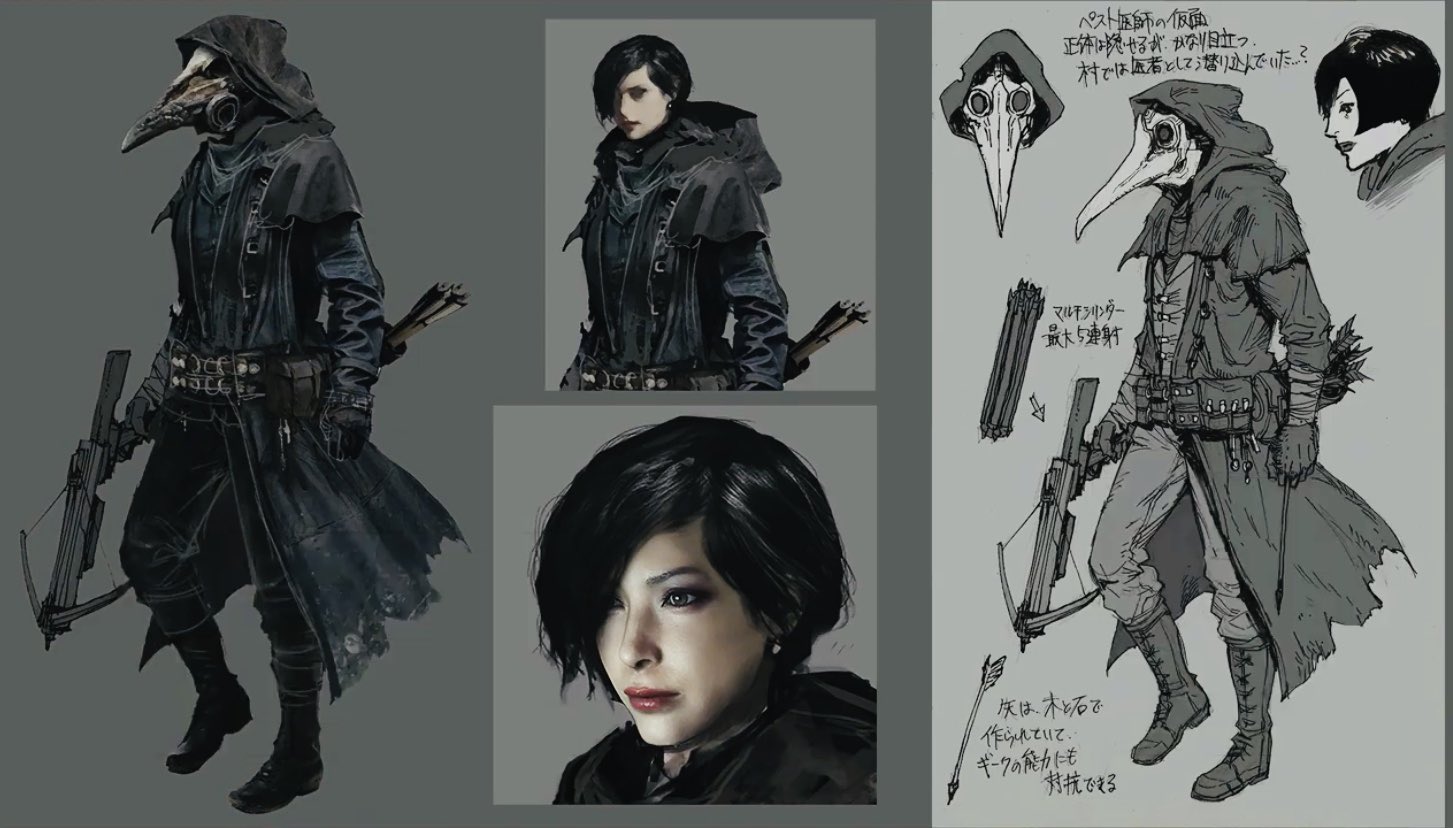 【《生化危机8》原本将加入“艾达王”,采用中世纪鸟嘴医生装扮】《生化危机8》豪华版附赠的艺术设定图透露,原本“艾达王”也会在游戏中登场。起初的设定是“艾达王”身穿类似中世纪鸟嘴医生的装扮,武器是可以五连发的十字弩,在游戏中将救下伊森。不过由于最后考虑到剧情上会出现许多相互矛盾的点,因此最后取消了这一设定。