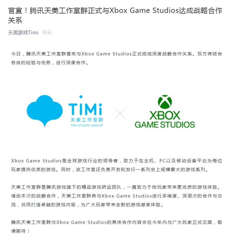 腾讯天美工作室群宣布与Xbox Game Studios结成深度战略合作关系