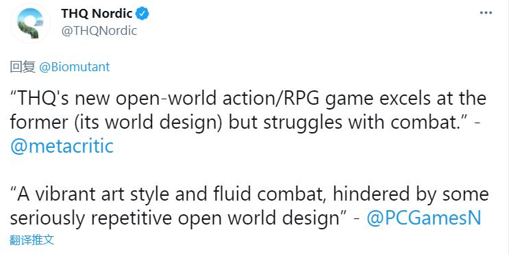 【《生化变种》发行商建议玩家亲自游玩后再作出评价】《生化变种》发行商THQ Nordic官推发文展示了Metacritic某位玩家以及媒体PCGamesN的评价。前者评价称,“《生化变种》开放世界的设定表现出色,但战斗体验比较糟”;后者评价称,“《生化变种》有着充满活力的艺术风格和流畅的战斗,但重复性较高的开放世界设计体验比较糟”。