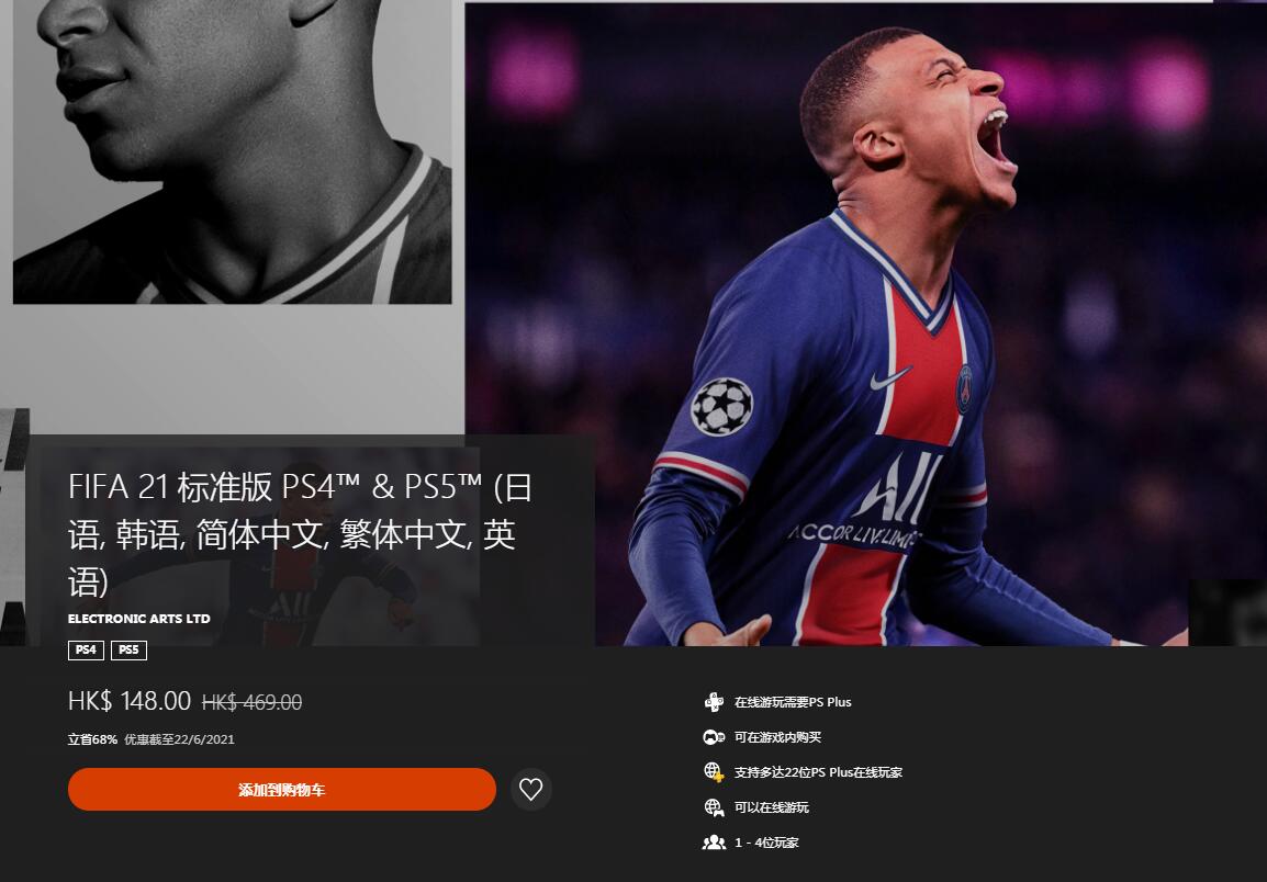 【PSN HK商店《FIFA 21》折扣价148HKD】《FIFA 21》目前在PSN HK商店开启优惠,原价469HKD,折后价148HKD,活动截止至6月22日。