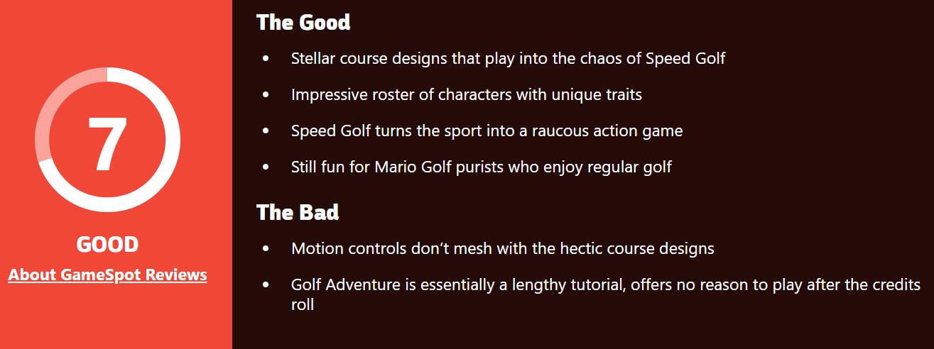 IGN评测表示:游戏的“高速高尔夫”玩法非常有趣,通过在挥杆之间进行疯狂的竞跑来填补挥杆之间的空间,从而为高尔夫题材游戏增添趣味。但游戏也存在其他缺陷,比如糟糕的冒险模式、可重复游玩的内容较少等。像这样的街机类型高尔夫游戏本质是为了可以和朋友一起玩很长的时间,但目前看来游戏内容量还无法达到。考虑到游戏没有如此“长寿”的游玩内容支持,因此无法将其归类于顶级的“马里奥高尔夫”游戏类别之中。