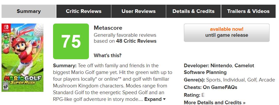 【《马力欧高尔夫 超级冲冲冲》媒体评分公布,IGN 6分/GameSpot 7分】《马力欧高尔夫 超级冲冲冲》媒体评分公布,IGN打出6分,GameSpot打出7分,目前在评分收录网站Metacritic上的媒体均分为75分(收录了48家媒体的评分)。