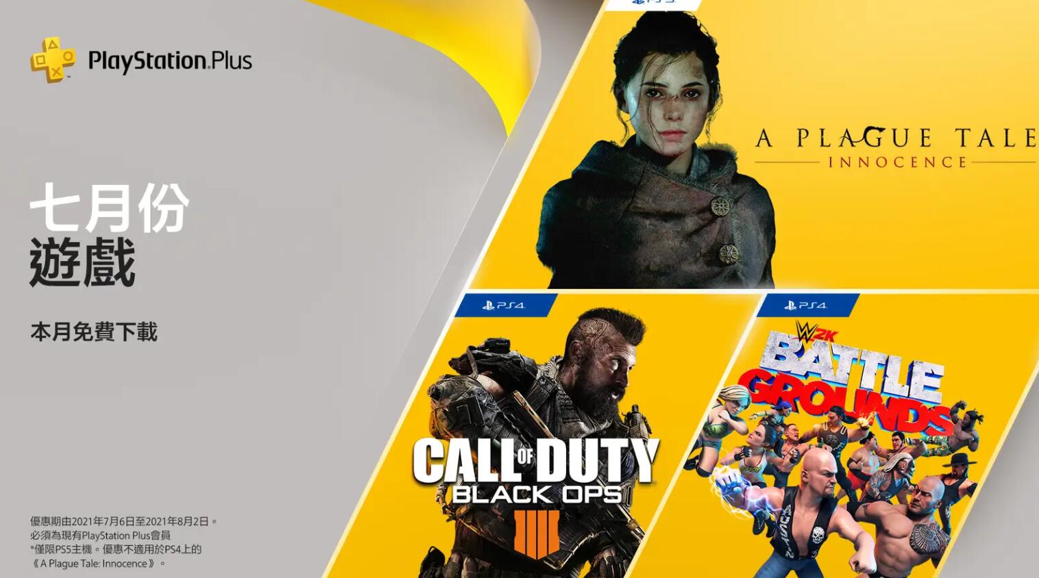 #更新# PS4《COD 黑色行动4》、PS4《WWE 2K竞技场》免费领取现已开放。 #原文#【会免游戏PS5《瘟疫传说:无罪》已开放领取】目前PSN HK商店已开放7月会免游戏PS5《瘟疫传说:无罪》的领取;另外两款游戏PS4《COD 黑色行动4》、PS4《WWE 2K竞技场》预计会在稍后陆续开放,本月游戏领取时间截止至8月2日。