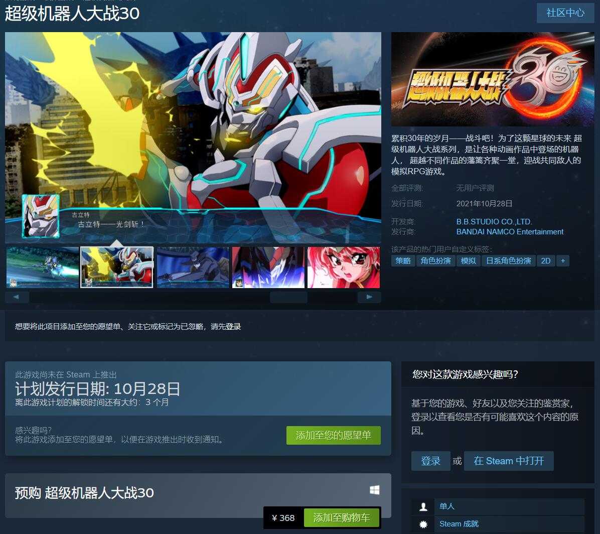 《超级机器人大战30》上架Steam,标准版368支持中文