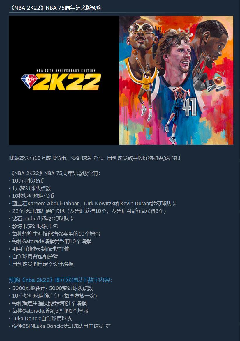 本次的《NBA 2K22》由卢卡·东契奇担任标准版的封面球星,卡里姆·贾巴尔、凯文·杜兰特、德克·诺维茨基共同担任75周年纪念版的封面球星。其中跨世代数字同捆包和NBA 75周年纪念版都提供了双主机世代PS4/PS5和 Xbox One/Xbox Series X|S游戏版本,让玩家能在同一PlayStation和Xbox主机家族的前世代和新世代主机上游玩。游戏将于9月10日正式发售。