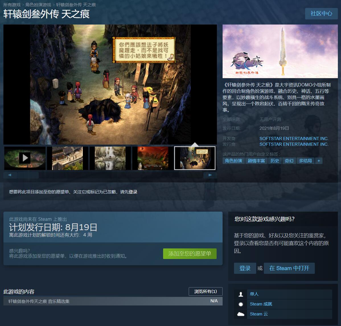 《轩辕剑叁外传:天之痕》Steam页面开启,将于8月19日发售