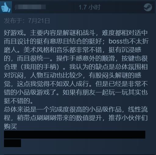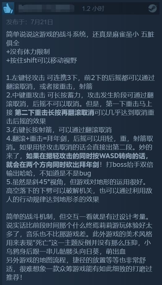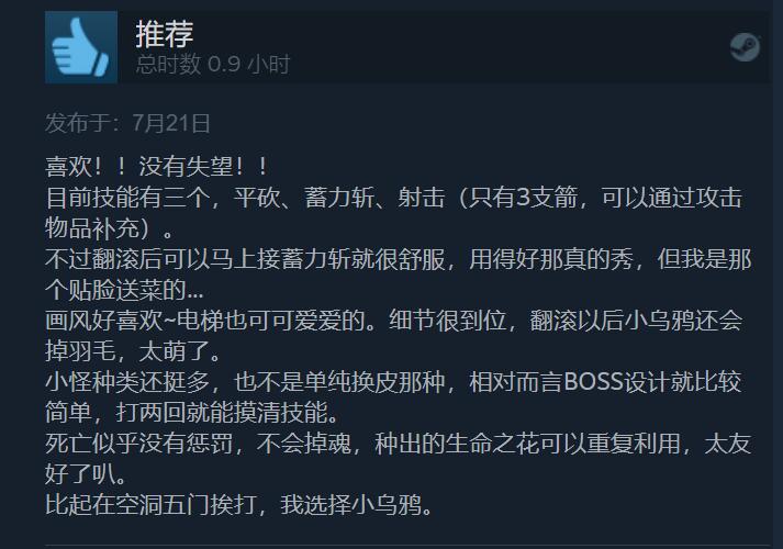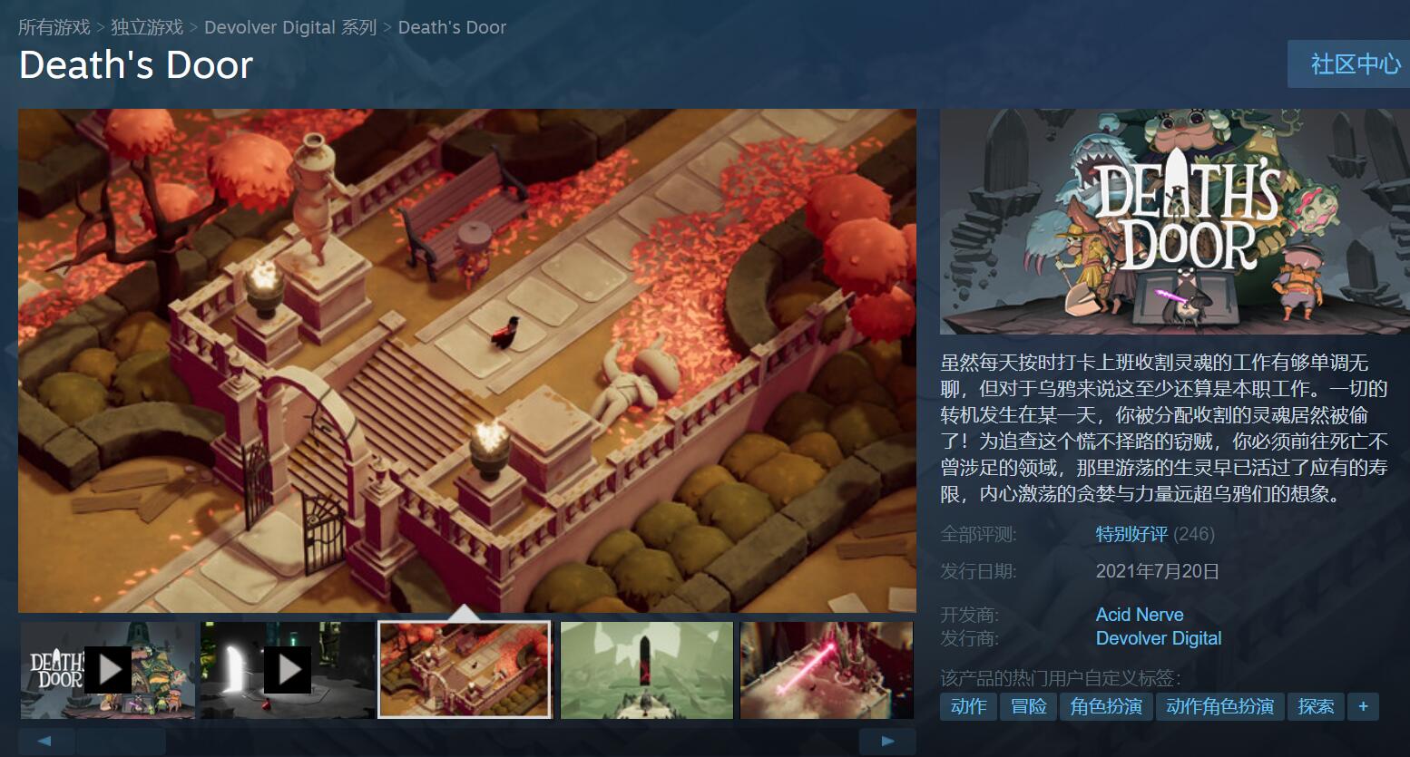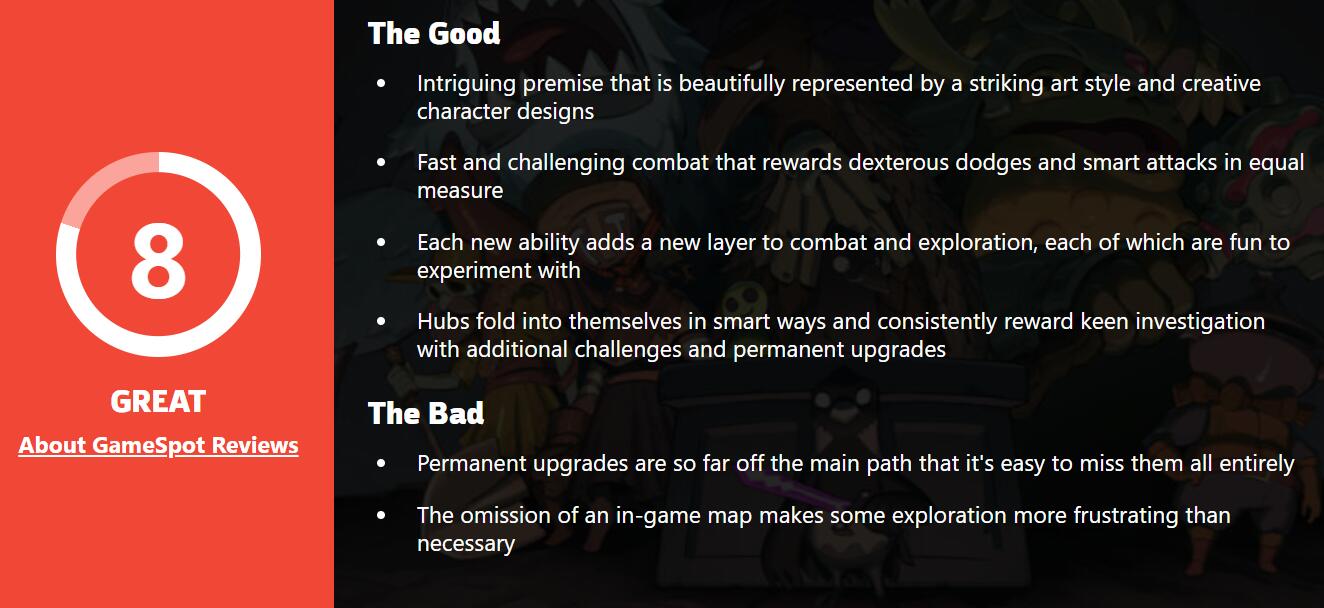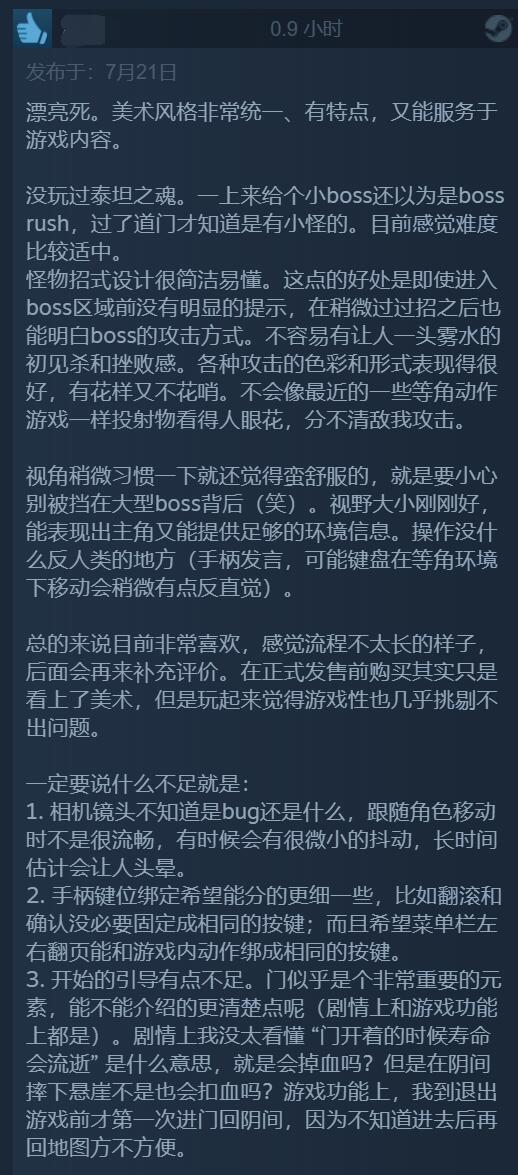 【独立新游《死亡之门》获IGN 9分/GS 8分评价,Steam玩家评分“特别好评”】已于7月20日发售的独立游戏《死亡之门》引起广泛好评,获得了IGN 9分,GameSpot 8分的优秀评价。目前该游戏的PC版在MC上均分达到了86分,在Steam玩家群体内也是“特别好评”,246篇玩家评价中有92%的好评,例如有玩家表示这款游戏就像是《奥日》和《空洞骑士》的结合,且众多玩家一致认为游戏的美术风格和配乐令人印象深刻。但也有玩家表示游戏战斗可能有点小瑕疵,最终BOSS战略显无聊。但瑕不掩瑜,这款游戏绝对是今年可以可以排进前列的佳作。