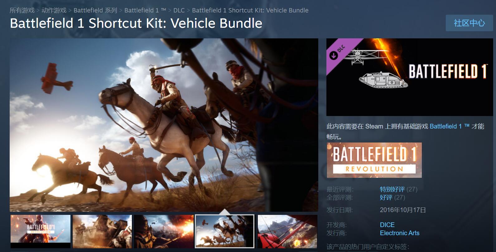 【原价88元的《战地1》DLC载具同捆包Steam免费领取中】原价88元的《战地1》DLC载具同捆包(Shortcut Kit: Vehicle Bundle)目前正在Steam平台开放免费领取,领取活动截止至7月30日上午1点。载具同捆包能立即解锁所有《战地1》多人模式中的载具包裹,以及飞行员与坦克兵兵种的主要武器、佩枪与配备。