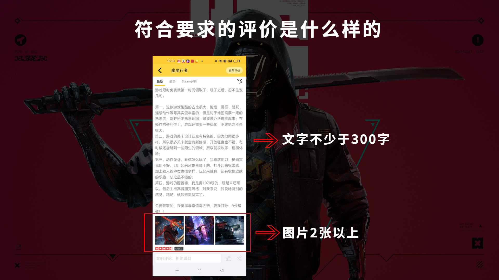 活动要求:在游戏详情页写下不少于300字且不少于2张图片的游玩评价