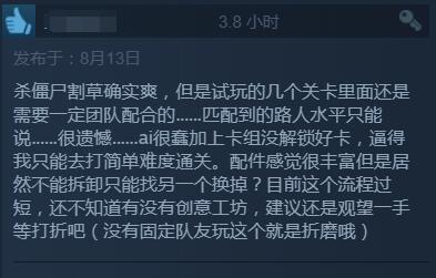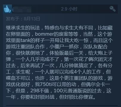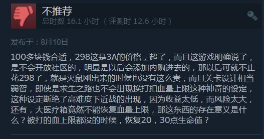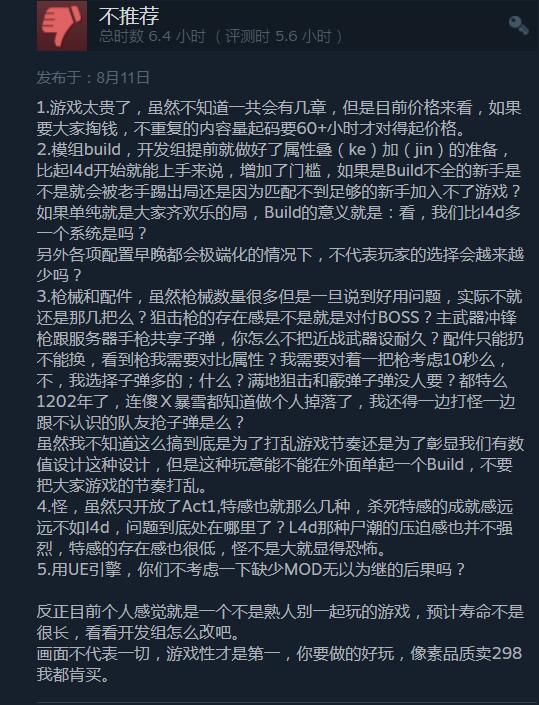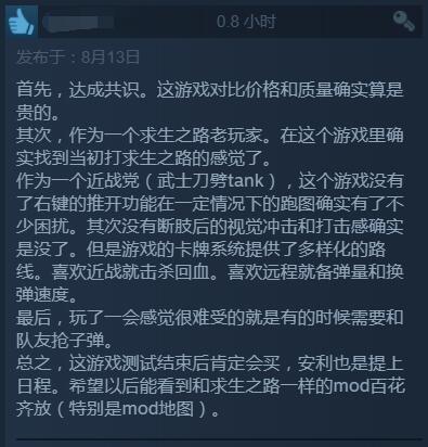 【《喋血复仇》B测Steam玩家评价“褒贬不一”:价格太贵,与现有内容不匹配】求生之路精神续作《喋血复仇》Beta测试今日已正式开启,截至目前游戏在Steam平台收获6061份评测,好评为67%,总体评价为“褒贬不一”。目前玩家普遍反映该作实在是太贵了!不少好评中也有玩家表达了这一看法,认为游戏现在内容对不起这个价格(普通版298元,豪华版428元,终极版488元)。此外,游戏评论中还提到了一些优化问题、希望官方未来开放创意工坊、弹药补给设定不合理、匹配联机体验比较糟糕等问题。