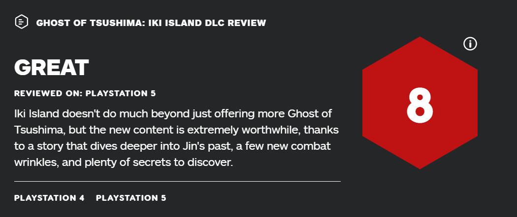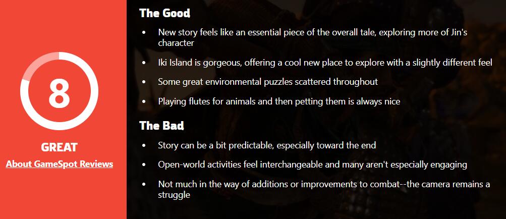 GameSpot表示,“壹岐岛”DLC是《对马之魂》整个故事的重要组成部分,探索了关于“仁”的更多内在。壹岐岛不仅美丽,也包含了很多可探索的新内容,以及一些很棒的环境谜题。能撸各种动物的体验也很不错。不足之处在于,剧情和结局容易让人猜到;场景的一些任务不是特别吸引人;战斗体现上的改进并不多,并且战斗镜头体验仍就糟糕。