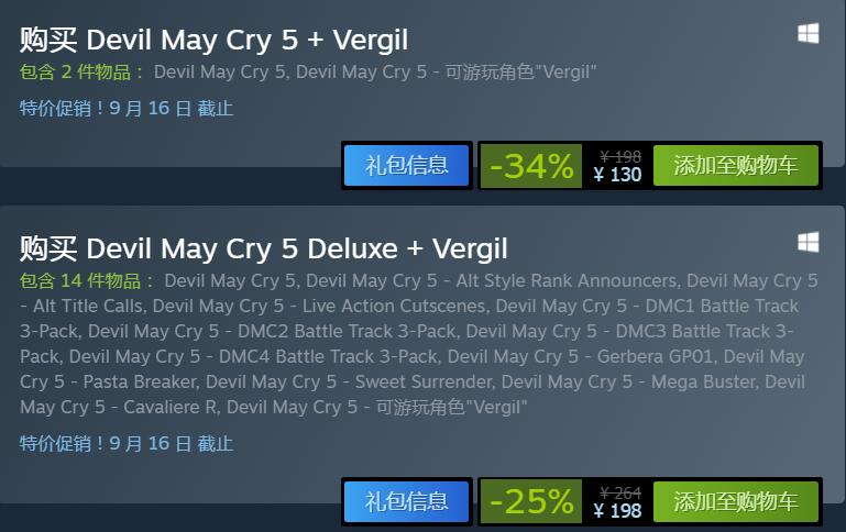 【Steam平台《鬼泣5》销售模式进行了调整】Capcom目前对Steam上《鬼泣5》的销售模式进行了调整,原先可以单独购买的游戏标准版本体、豪华版本体已下架,调整为了标准版本体+维吉尔DLC同捆包、豪华版本体+维吉尔DLC同捆包的形式,目前优惠价分别为130元(原价198元)和198元(原价264元)。