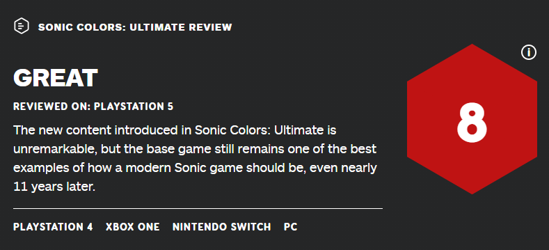 《索尼克 缤纷色彩 究极版》获IGN 8分:新意虽少,但原作的优秀使游戏仍值一试