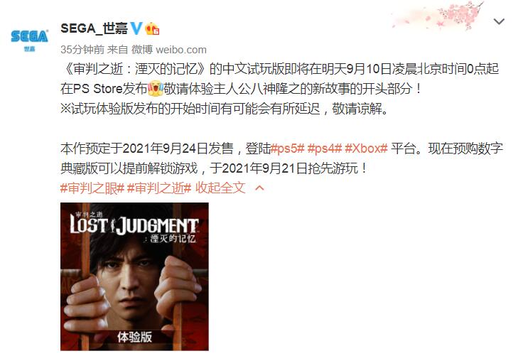 【《审判之逝》体验版9月10日登陆PSN商店】SEGA宣布《审判之逝:湮灭的记忆》中文试玩版即将在北京时间9月10日凌晨0点起上线PSN商店。游戏正式版将于9月24日登陆PS4/PS5/Xbox One/Xbox Series平台,中文版同步发售。