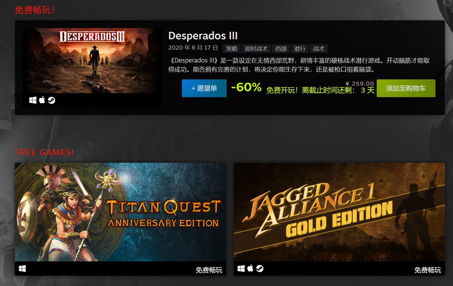 【战术潜行游戏《赏金奇兵3》开启Steam限时免费游玩】目前Steam开启了“THQ Nordic 十周年纪念”专题活动,《泰坦之旅 十周年纪念版》(有中文)和《铁血联盟1:黄金版》(无中文)两款经典游戏开启免费领取,活动截止至9月24日上午1:00;战术潜行游戏新作《赏金奇兵3》开启为期3天的限时免费游玩活动,同时本作还开启了4折优惠(103元),优惠截止至9月24日;此外还有大量THQ Nordic旗下游戏开启了优惠活动。