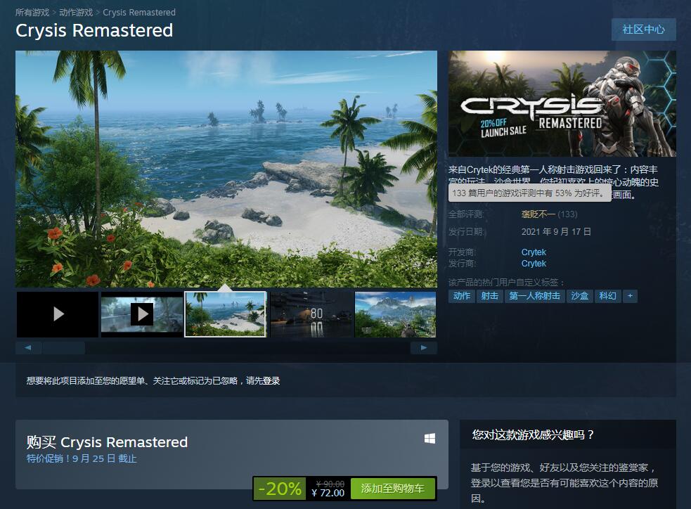 【Steam《孤岛危机HD》褒贬不一,优化效果堪忧】《孤岛危机 高清重制版》今日正式登陆Steam平台,目前在133篇用户评价中,只有53%的玩家给出了好评。从评论区来看,大家抱怨的重点主要在于游戏的优化水平堪忧,许多使用RTX 3080显卡的玩家在高画质下也很难稳定在60帧。即便是高清重制,游戏的过场动画也是沿用旧版,有玩家认为高清重制版的画面效果甚至不如旧版游戏打补丁。此外,游戏也存在大量的Bug,比较影响游戏体验。目前游戏首发特惠售价72元(-20%),支持中文。