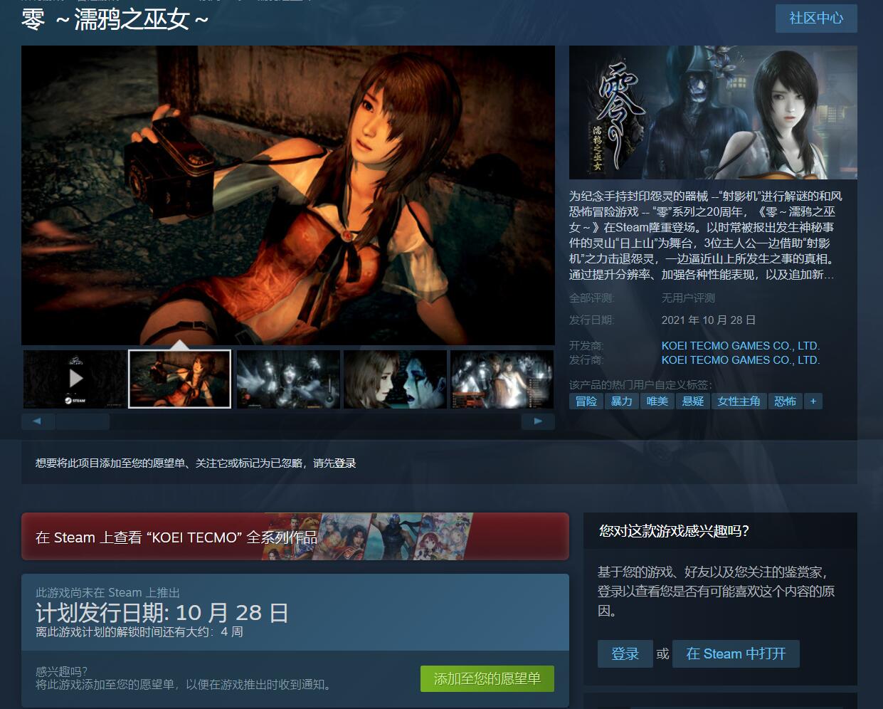 【《零:濡鸦之巫女 HD高清重置版》上架Steam】光荣特库摩的美少女惊悚冒险游戏《零:濡鸦之巫女 HD高清重置版》现已上架Steam平台,游戏支持中文,将于10月28日发售,目前售价未公布。游戏首发特典为夕莉限定服装“莱莎的衣服”、“莱莎的帽子”,通关后可游玩"绫音篇"体验特别任务。相较于原作,高清重制版提高了画面分辨率,增加了新服装、饰品,追加了新操作模式。除了Steam之外,游戏也将登陆PS4、PS5、Xbox One、XSX/S以及Switch平台。