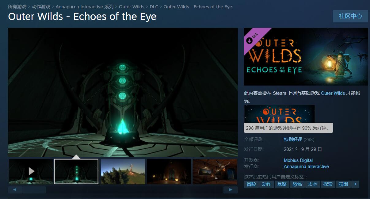 【《星际拓荒》DLC“眼的回声”今日发售,Steam获玩家“特别好评”】开放世界冒险游戏《星际拓荒》DLC“眼的回声(Echoes of the Eye)”今天正式发售,目前在Steam平台上该DLC获得了“特别好评”的玩家总评,好评率为96%。《星际拓荒》曾被Polygon、Eurogamer评为“2019年度游戏”。游戏背景是一个困在无尽的时间循环之中的太阳系,玩家将饰演一名宇宙探险队的新人队员,去探索充满未知的太空区域。