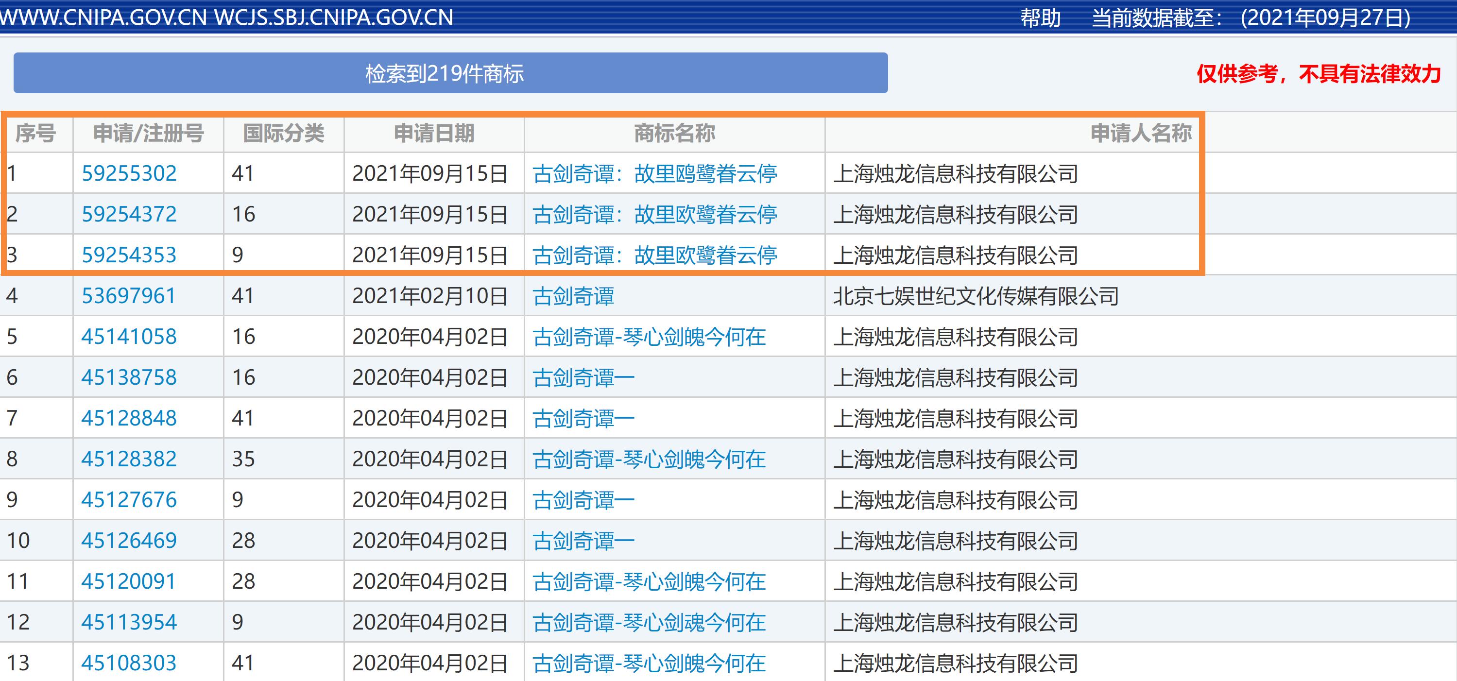 【疑似《古剑奇谭四》标题曝光:故里鸥鹭眷云停】国家知识产权局商标局 商标查询信息显示,上海烛龙信息科技有限公司申请了三款名为“古剑奇谭:故里鸥鹭眷云停”的商标。