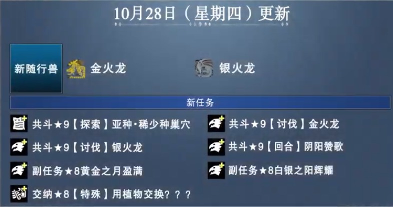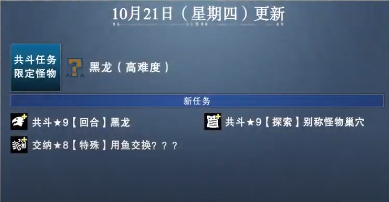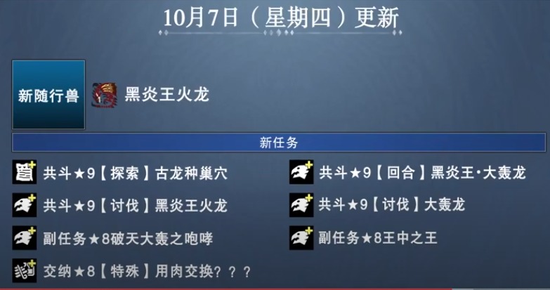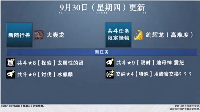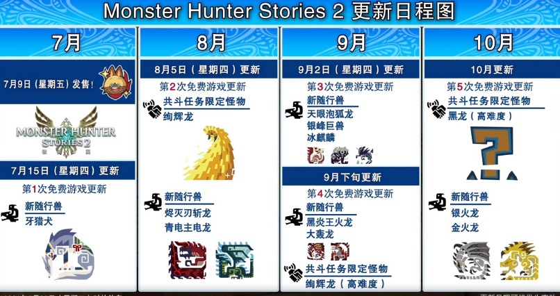 【《怪物猎人物语2》后续更新内容公布:大轰龙、黑炎王、金银火龙以及黑龙登场】Capcom公布了RPG游戏《怪物猎人物语2:破灭之翼》的最新后续更新计划,首先是第四次免费更新内容:有新随行兽大轰龙、共斗任务限定怪绚辉龙(高难度)、黑炎王火龙,分别将于9月30日和10月7日推出;其次第五次免费更新内容:有共斗任务限定怪黑龙(高难度)、新随行兽金火龙银火龙,分别将于10月21日和10月28日推出。