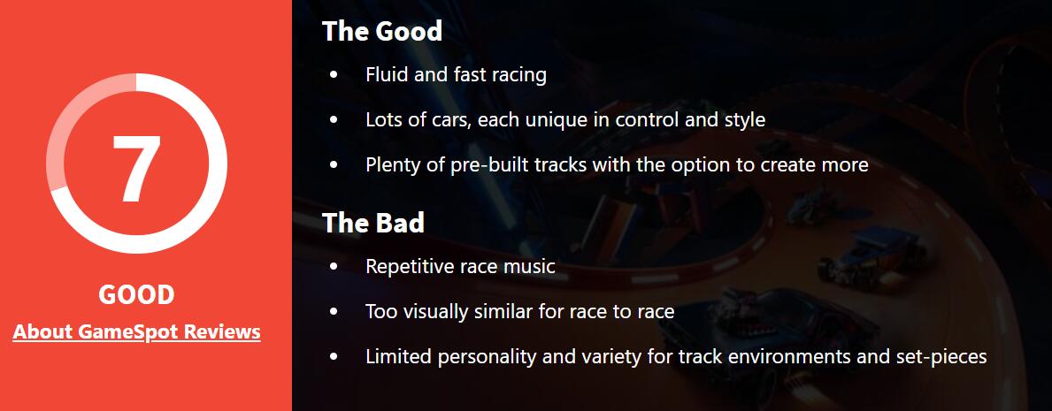 【《风火轮:爆发》GameSpot给出7分评价】GameSpot为《风火轮:爆发》打出7分评价,具体评价为:《风火轮:爆发》将街机赛车与怀旧相结合,让您可以在小型玩具车中穿过充满创意的塑料跑道。唤起了玩家对儿时玩具小车的记忆,再加上出色的驾驶机制,让《风火轮:爆发》充满了乐趣。游戏通过不断挑战获得升级材料、硬币和可解锁物品的形式提供奖励。每辆车都有不同的操控性和速度,掌握弯道漂移和加速时间是一种具有挑战性的体验。但游戏缺点也比较明显:虽然每条预建的赛道都有不同的布局和障碍,但所有比赛都在地下室、车库、滑板公园、摩天大楼或大学校园中进行。这就导致了游戏最大的问题缺乏视觉上的多样性。另外游戏里的音乐虽然很有街机氛围,但同样缺乏多样性意味着一段时间后它会变得重复。游戏现已登陆PS5、XSX/S、PS4、Xbox One、Switch和Steam平台。