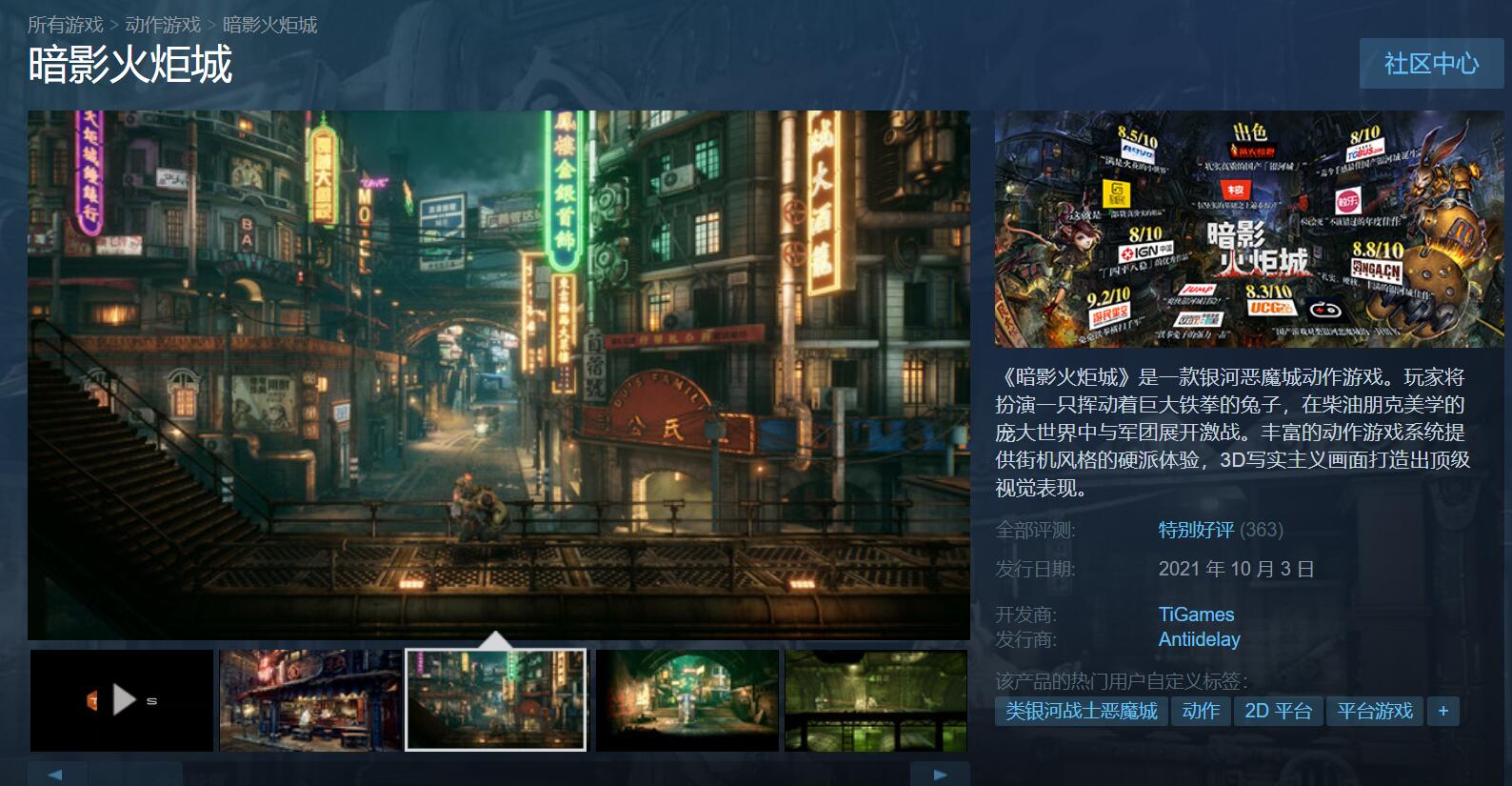 【《暗影火炬城》Steam获玩家“特别好评”】银河恶魔城国产动作游戏《暗影火炬城》昨日已在Steam平台发售,截止到今日,本作已经收到了363份评价,获“特别好评”,好评率为89%。不少玩家对本作的美术,战斗系统还有配乐打出好评。差评方面,也大多集中在对本作的帧数优化,以及突发性BUG上。希望制作团队能够在后续继续对游戏的细节方面进行优化和打磨。