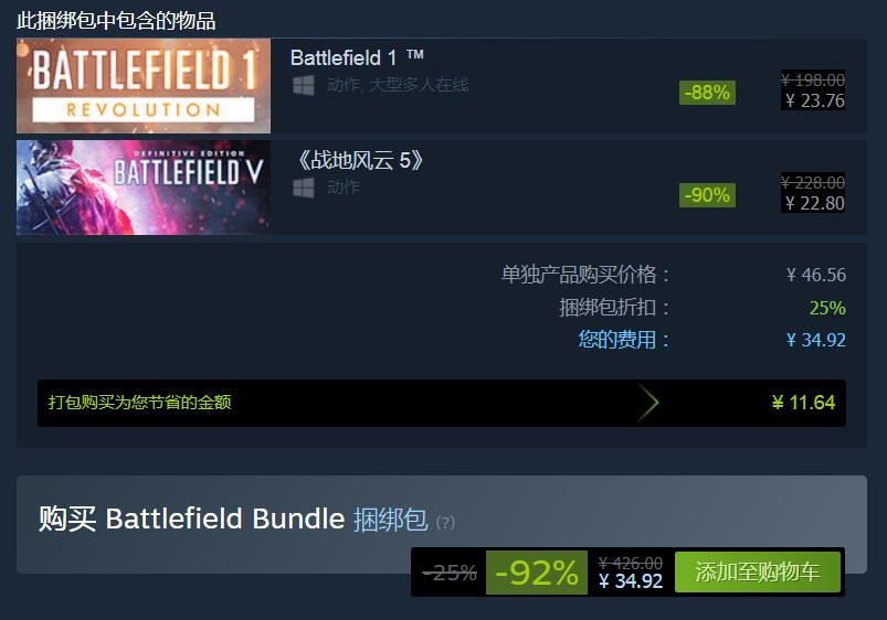 Steam平台《战地1》和《战地5》开启史低优惠,《战地1》折后价23.76元,《战地5》折后价22.8元,两款游戏同捆版为34.92元,活动截止10月19日 。