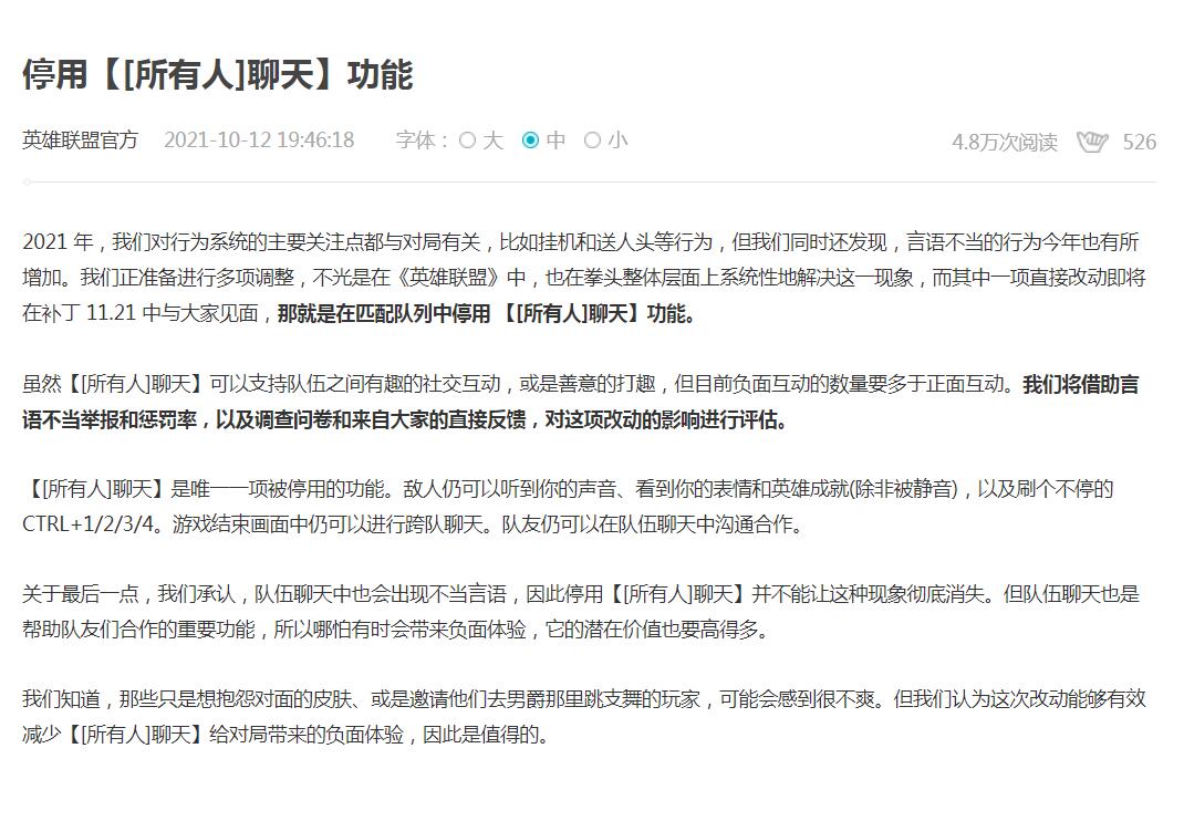 【《英雄联盟》将停用匹配队列“所有人聊天”功能】《英雄联盟》官网发布公告,宣布即将在匹配队列中停用“所有人聊天”功能。官方表示,虽然“所有人聊天”可以支持队伍之间有趣的社交互动,或是善意的打趣,但目前负面互动的数量要多于正面互动。官方将借助言语不当举报和惩罚率,以及调查问卷和来自大家的直接反馈,对这项改动的影响进行评估。