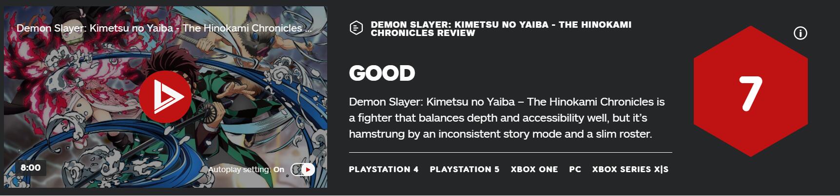 《鬼灭之刃:火神血风谭》获IGN 7分评价