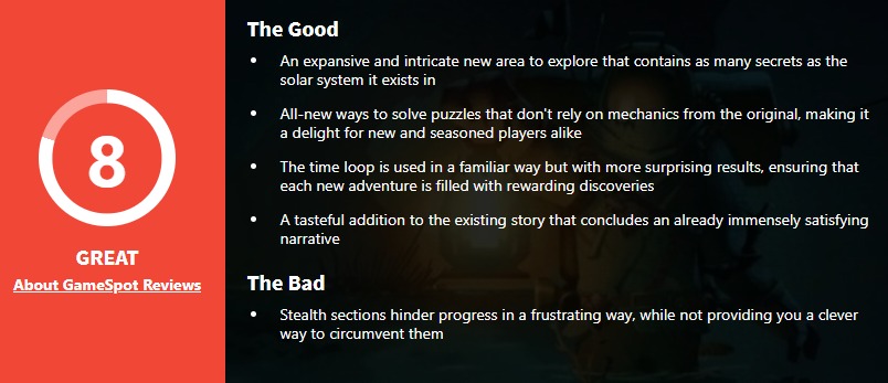 【《星际拓荒》“眼之回响”大型DLC获GS7分评价】开放世界冒险游戏《星际拓荒》大型DLC已于此前发售,本作在Steam平台目前保持着92%的好评率,IGN也给出了8分的评价。今日外媒GameSpot为本作打出了7分,认为本次的大型拓展包为玩家提供了一个全新的广阔且复杂的区域来探索,有着和太阳系同样丰富的秘密,以及全新的解谜机制让新老玩家都可以乐在其中。虽然游玩方式上变化不大但每次新冒险都充满着新意,并且游戏对剧情做了进一步的补充,让玩家得到了一个十分满意的结局。不过游戏里世界之后的潜行部分实在有些影响游戏体验。