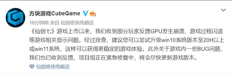 【方块建议升级Windows系统,获得《仙剑奇侠传 七》更加稳定的体验】《仙剑奇侠传七》已经于近日在方块游戏平台率先上线。不过游戏上线以来,许多有玩家反馈GPU发生崩溃、游戏过程闪退等游戏相关显示问题。方块游戏平台今日表示,“经过排查,建议可以尝试升级win10系统版本至20H以上或win11系统,这样可以获得更稳定的游戏体验。此外关于游戏内一些BUG问题,我们也已收到反馈,项目组正在紧急修复中,将会尽快更新游戏版本。”
