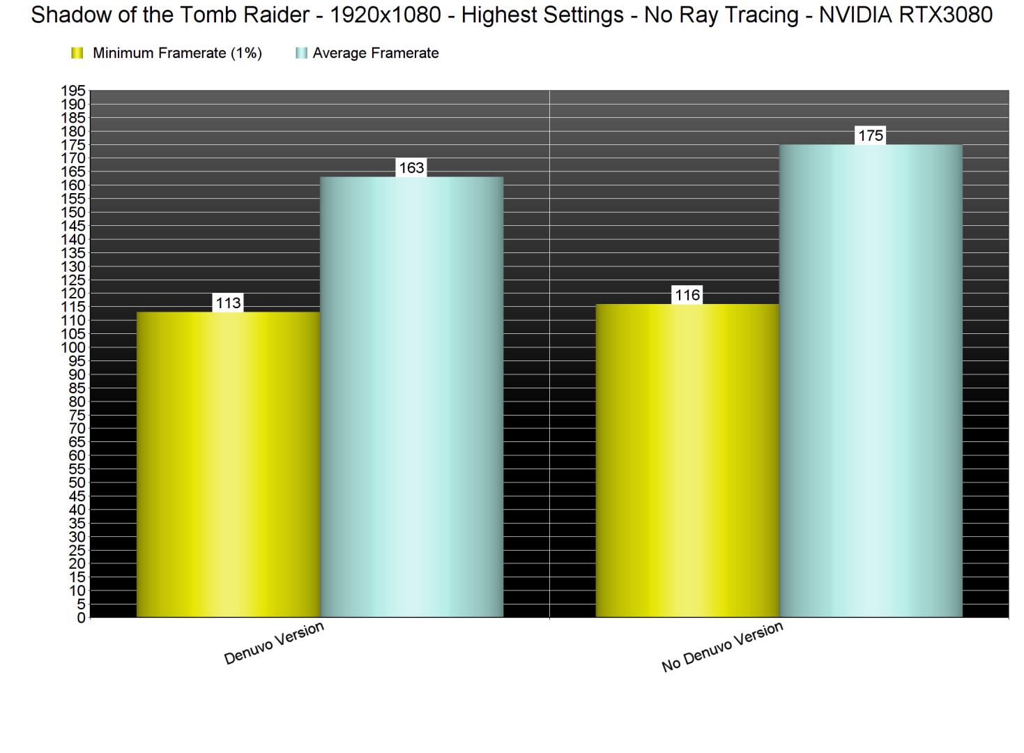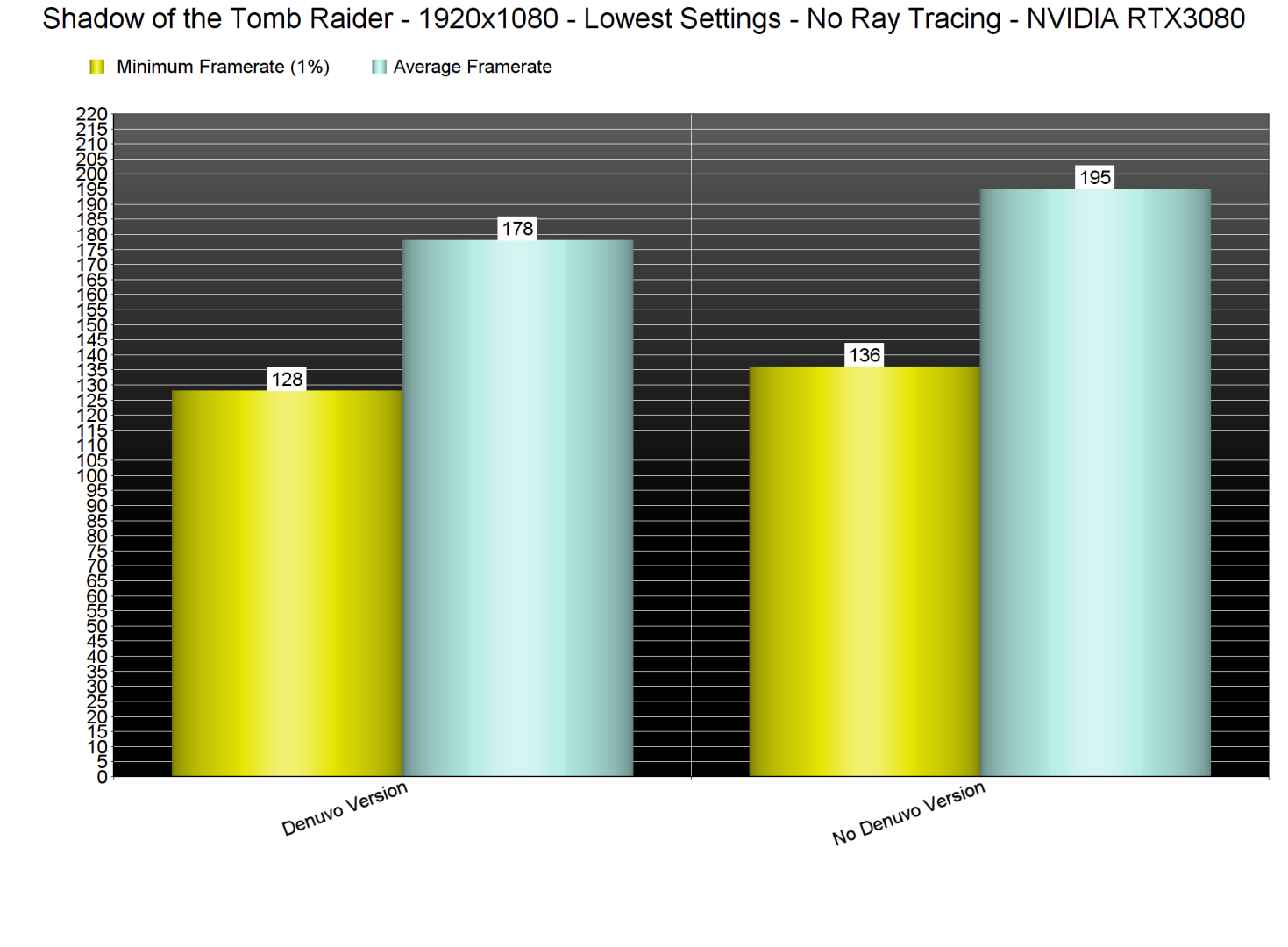 【去除D加密后《古墓丽影:暗影》性能提升明显】几天前,SE和Crystal Dynamics移除了《古墓丽影:暗影》中的D加密技术。众所周知,D加密会额外消耗CPU资源。于是在一台使用i9 9900K和3600Mhz的16GB DDR4以及NVIDIA 的RTX 3080的PC平台下,分别对开启D加密和不开启D加密的《古墓丽影:暗影》进行评测。在不开启光追及DLSS的前提下,设置为1080p并开启最高设置,两个版本在内置基准测试的性能已有不少差异。而将图形设置降低到最低时,可以看到最低帧率提高了8fps,平均帧率提高了17fps。这是一个非常显著的性能提升。不仅如此,一些使用更老旧的CPU的玩家可能会有更明显的性能提升。这最终意味着D加密确实影响了《古墓丽影:暗影》的性能。因此《古墓丽影:暗影》完全可以视为D加密负优化的典型案例。