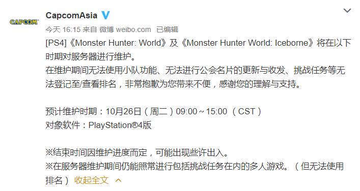 Capcom宣布PS4版《怪物猎人:世界》和《怪物猎人:世界 冰原》将于10月26日9:00~15:00期间对服务器进行维护,在维护期间无法使用小队功能、无法进行公会名片的更新与收发、挑战任务等无法登记至/查看排名。