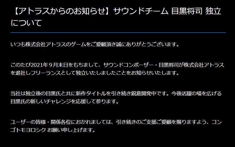 目黑将司随后在个人社交平台上表示,在离开Atlus后自己将专注于开发独立游戏的梦想。目黑将司此前在参加讲谈社举办的游戏创作实验室活动,自己在5年前就已经开始利用私人时间学习使用虚幻4引擎开发游戏,正在制作的游戏将于11月6日公布。此外在专注于开发独立游戏的同时,未来也会继续与Atlus在游戏音乐方面进行合作。
