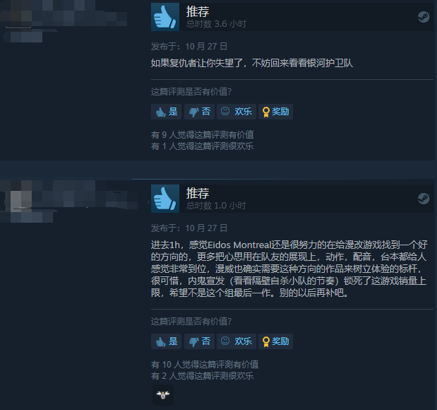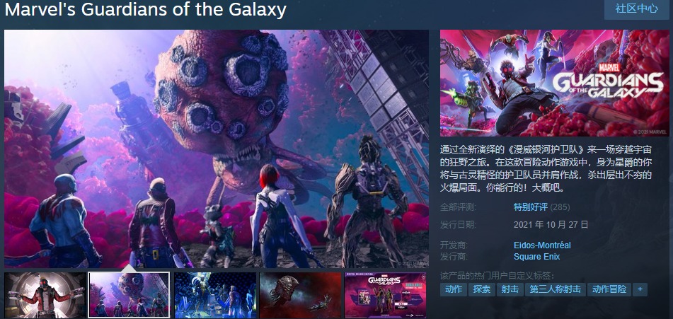 【《漫威银河护卫队》获Steam“特别好评”】由Eidos-Montréal打造,SE发行的《漫威银河护卫队》已经上架Steam,在目前已有的285份评测中,91%的玩家给予了好评,整体为“特别好评”。虽然此前SE推出的《漫威复仇者联盟》颇受争议,不过本次的作品还是不错的。玩家们普遍认为游戏的打斗十分爽快,并且简单易上手。配音和台词以及游戏整体流程上的体验都很到位。只是目前手柄和老生常谈的优化问题还有待完善。目前国区售价359元,支持简体中文。