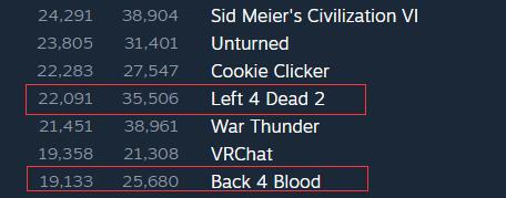Steam《求生之路2》当前玩家人数反超《喋血复仇》