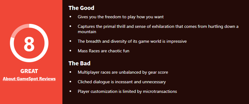 GameSpot认为:游戏为玩家提供了极大的自由发挥空间,精准抓住了从山上飞奔向下的那种最原始的快感,让人无不兴奋。开放世界的广阔性和多样性以及大型赛场那种混乱的场面让人印象深刻。不过多人比赛的平衡性还有待加强,一些老掉牙的对话也显得十分没有必要,以及氪金要素完全束缚住了玩家自定义的玩法。