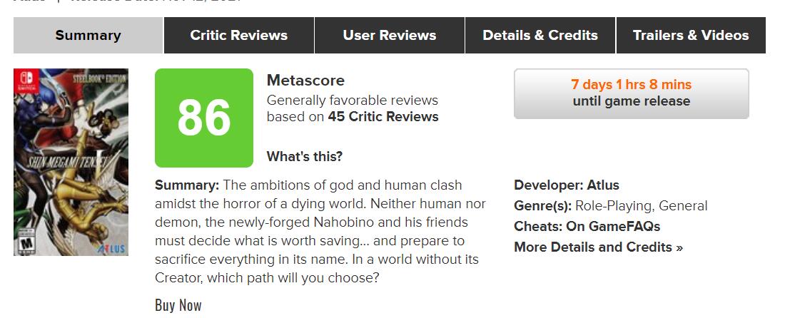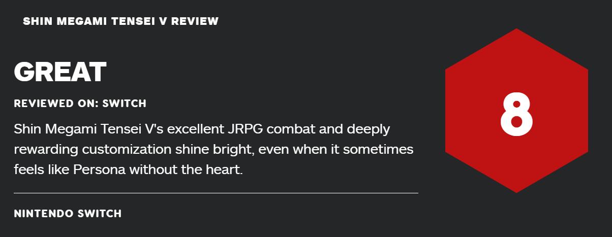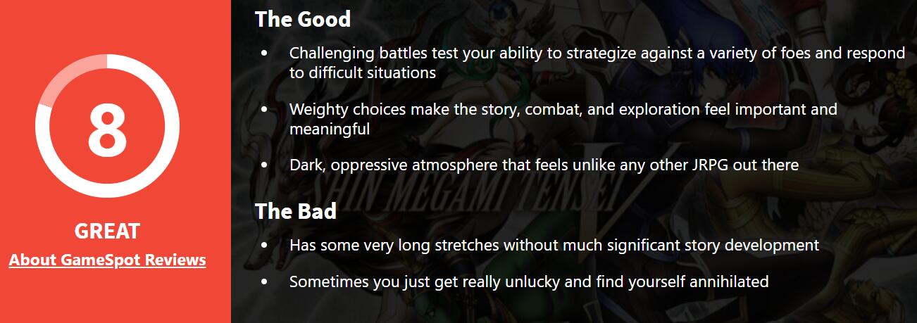 【《真女神转生5》获IGN、GS双双8分评价】《真女神转生5》全球媒体评分出炉,Metacritic目前平均分为86分,其中IGN和Gamespot均为本作打出8分的评价。