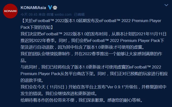 【《eFootball 2022》的1.0.0更新已推迟到2022年春季】9月科乐美发布了《eFootball 2022》,该游戏很快成为有史以来最糟糕的游戏之一。该游戏在Steam上获得了压倒性的负面评论。在这次糟糕的发布之后,科乐美道歉并承诺通过2021年11月的重大更新来修复游戏。但是该公司刚刚宣布此更新已推迟到2022年春季,鉴于此科乐美会把《eFootball 2022》 Premium Player Pack下架及进行自动退款,因为其中包含了版本1.0.0更新后才可使用的虚拟物品。并表示会努力在2022春季推出一个能够让大家感到满意的作品。1.0.0将为游戏添加新内容,包括新模式以及对移动设备的支持。
