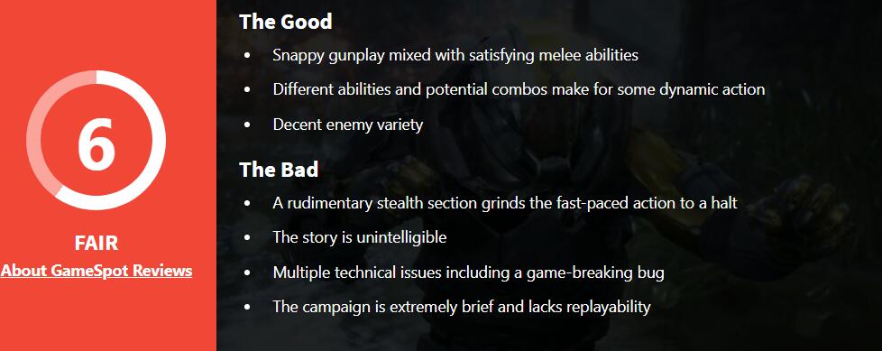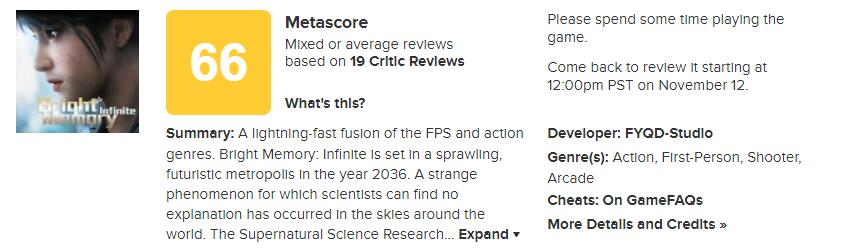 【《光明记忆:无限》获GameSpot 6分评价】《光明记忆:无限》全球媒体评分出炉,Metacritic目前平均分为66分(19家媒体),包括有Everyeye it 7.5分、GameSpot 6分、Multiplayer it 7分、Game Informer 7分。其中GameSpot评语为:优点方面为枪战射击与近战玩法的结合相当不错、各种能力可以组合造就出一些不同的打法、相当不错的敌人种类;缺点方面为隐形部分的玩法不太适合游戏本身的快节奏动作体验、故事剧情有些看不懂、有较多的技术问题、流程较短且缺乏可重玩性。