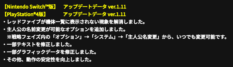 【《超级机器人大战30》NS/PS4版更新补丁现已推送】万代南梦宫今日推送了PS4/NS《超级机器人大战》Ver.1.11版更新补丁,主要内容有: 1.修复RED FIVE(银河机攻队主角机)在菜单中不可见的BUG。 2.追加可以更改主角姓名功能。 3.部分文本的修正。 4.部分图形数据的修正。 5.以及一些其他小BUG并提升了动作的稳定性。